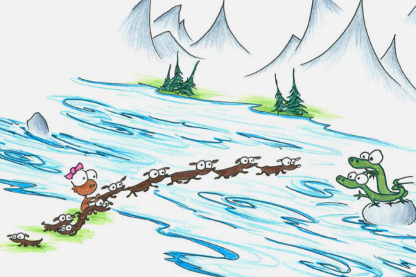 a story of a monkey who has all sorts of problems caused by the invisible alligators that sneak out each night from under her bed, and how things eventually work out for the best.